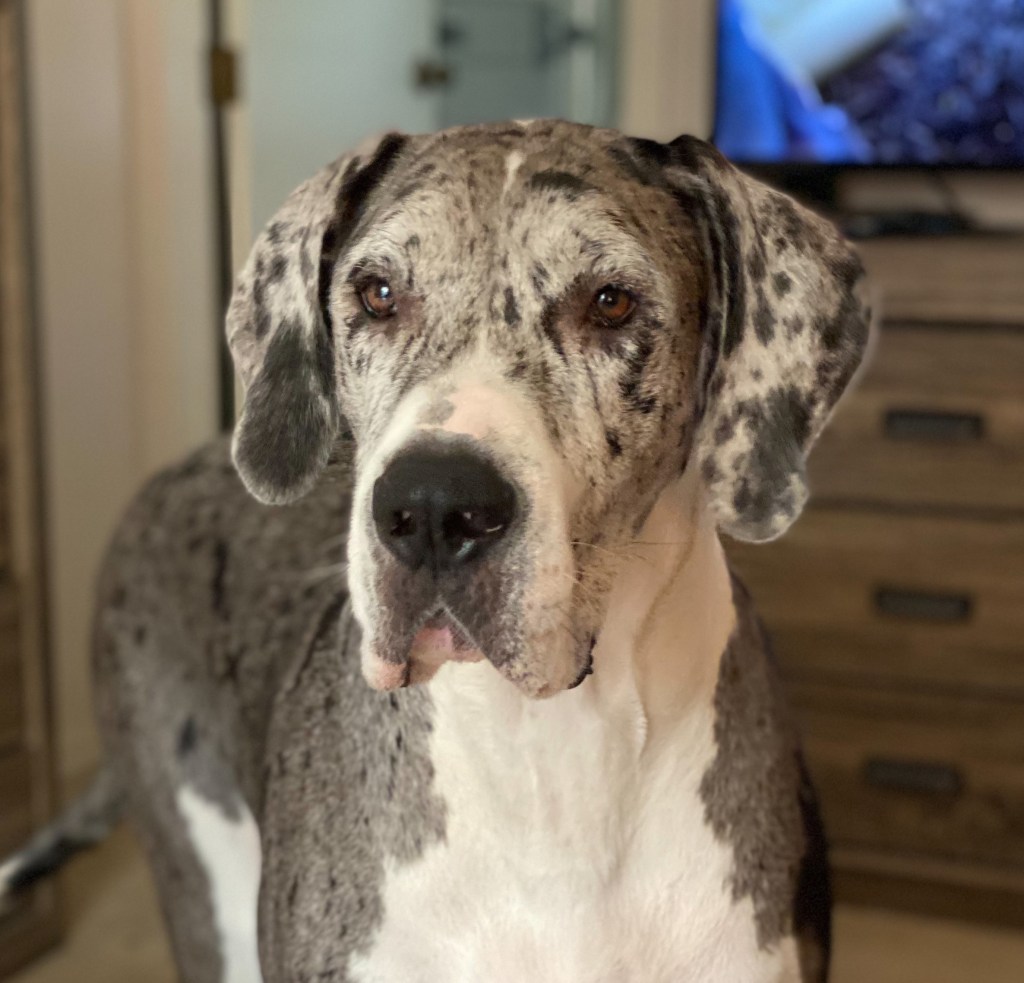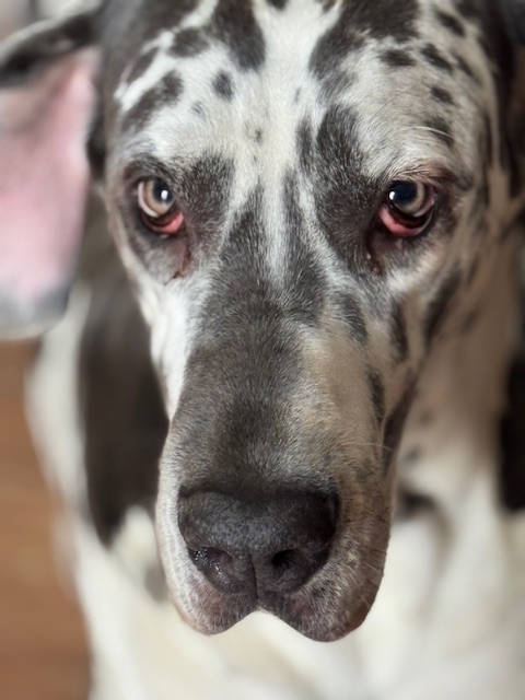 Minnie is a piebald Dane. Further color testing is in progress.