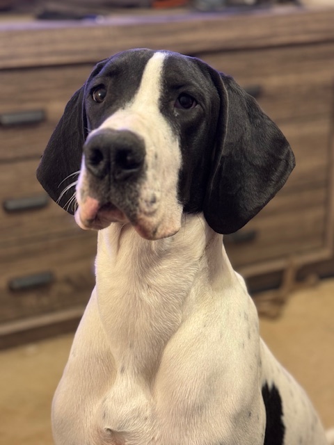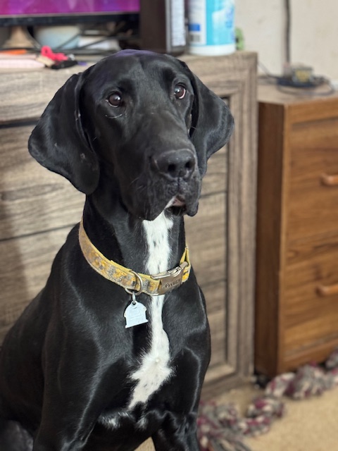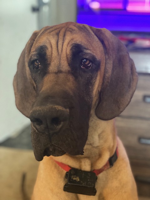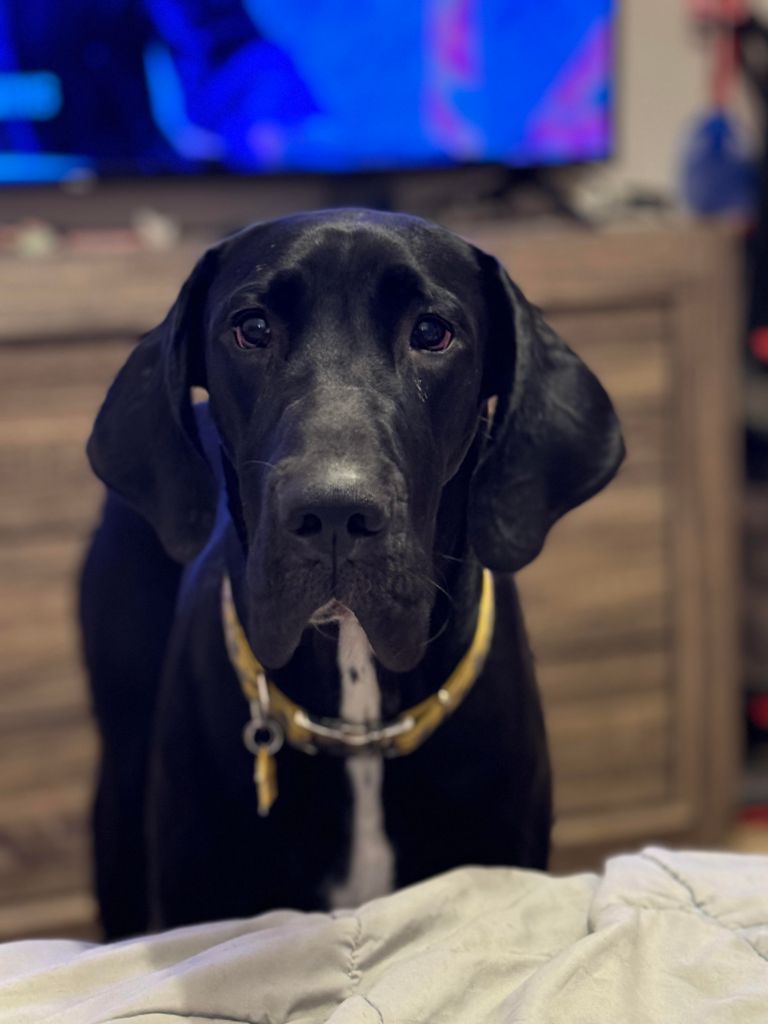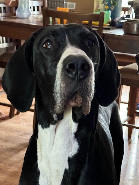 BooBoo is a black Dane. Color testing is in progress.